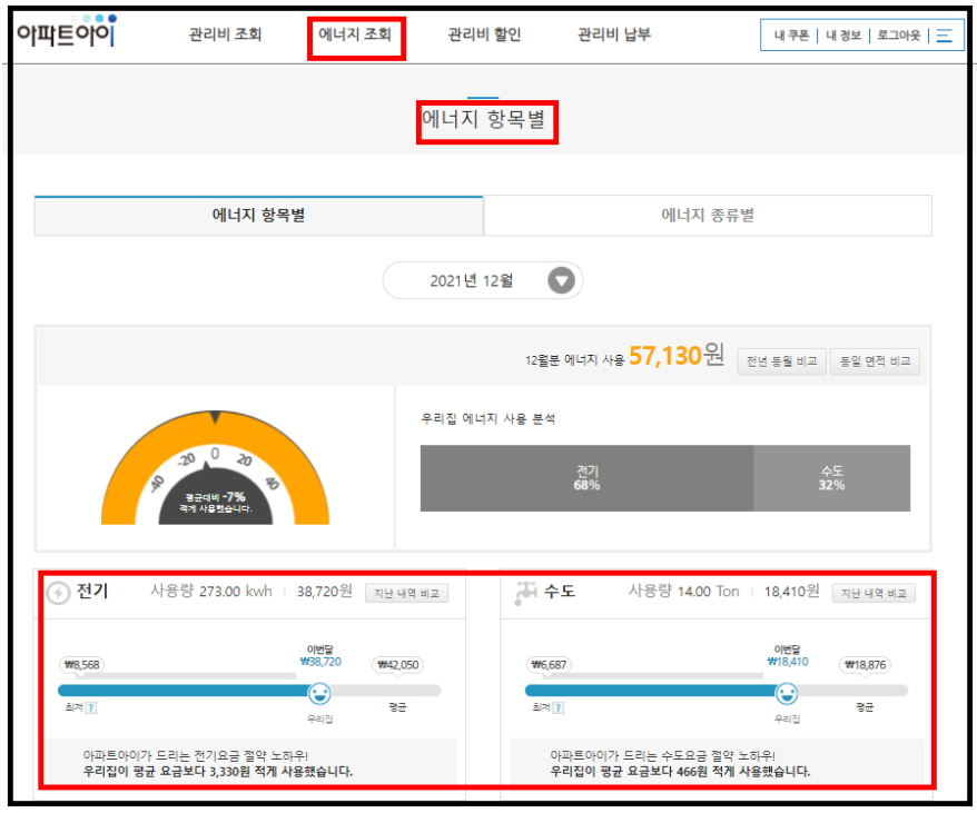 2) 에너지 항목별 검사를 클릭하면 우리집 에너지 사용량을 확인할수있습니다.