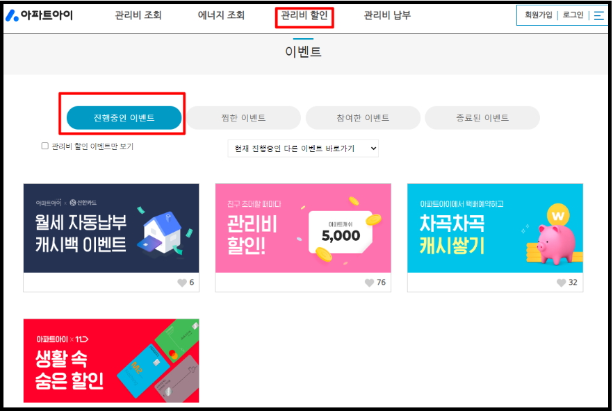 홈페이지 가운데 메뉴를 확인하시면 관리비할인이 있습니다.클릭하신후 현재 진행중인 이벤트가 있다면 참여하시고 관리비 할인 받으시기 바랍니다.
