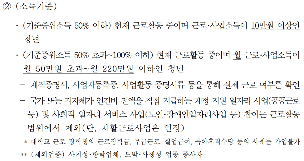 이번 제도는 소득이 없는 청년에게는 지원되지 않습니다. 따라서 지난달 발생한 근로소득 혹은 사업소득이 무조건 있어야 합니다. 차상위 이하라면 10만원 이상의 소득이 있어야 하며 초과 청년에게는 50만원 초과 220만원 이하여야 합니다.