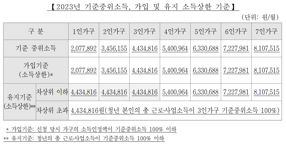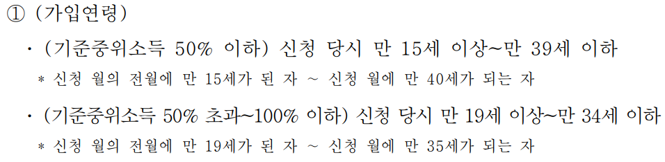 만약 자신의 가구소득이 50% 이하 중위소득 계층이라면 만 15세부터 만 39세까지로 가입자 연령폭이 다소 늘어납니다. 2008년생부터 1983년생까지가 청년이 되니 다소 완만해진다고 할 수 있겠습니다.