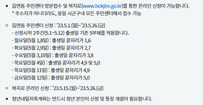 2023년 5월 1일(월) ~ 5월 26일(금) 까지 개인의 주소지와 시군구내 주민센터에서 신청이 가능합니다. 5월 15일부터는 복지로 홈페이지에서도 신청이 가능합니다.